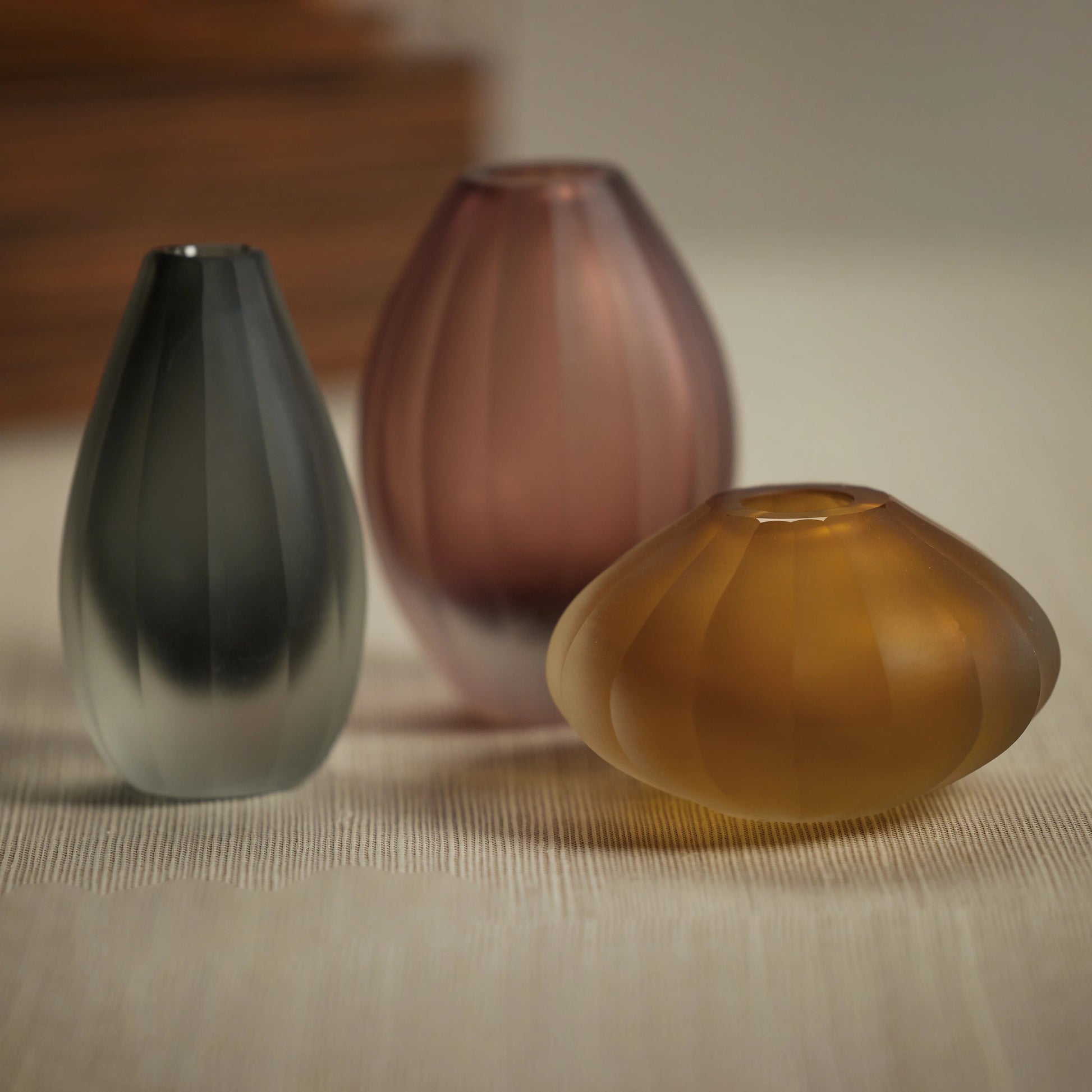 This trio of gorgeous and weighty frosted glass is a perfect centerpiece for a dining table or coffee table. As a grouping, these are perfect accent decor pieces. We love their muted colors and the soft texture from the frosted glass.